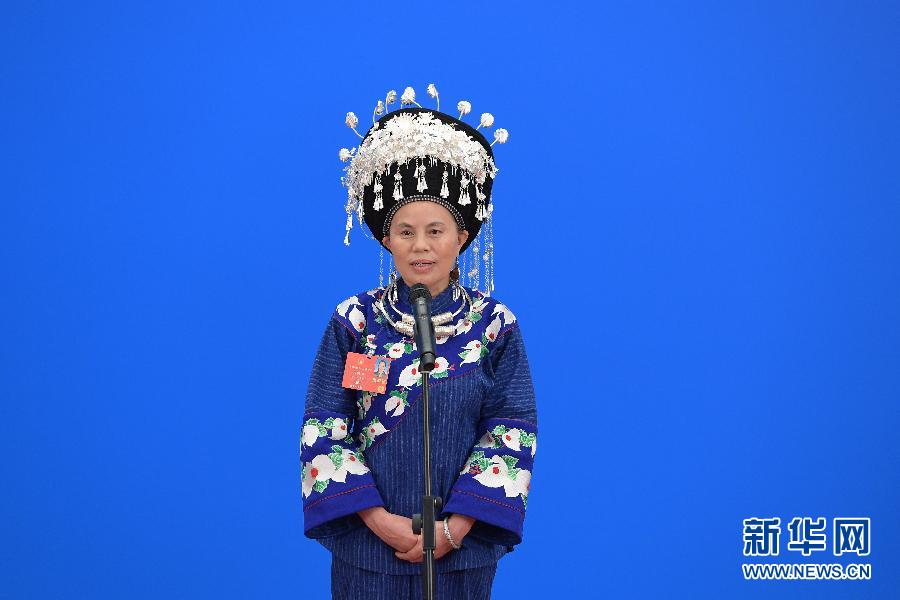 贵州松桃苗绣第七代传承人石丽平代表,身着民族服饰展示松桃群众的新生活、新气象。