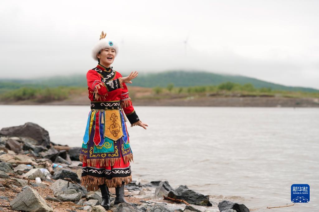 在黑龙江省同江市街津口赫哲族乡渔业村附近的黑龙江江畔,刘蕾展示一段赫哲族歌舞(2022年5月21日摄)。新华社记者 王建威 摄