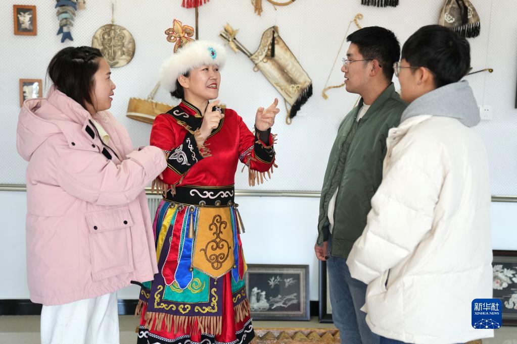 2月23日,在黑龙江省同江市八岔赫哲族乡八岔村伊玛堪传习所,刘蕾(左二)与年轻人交流。新华社记者 王建威 摄
