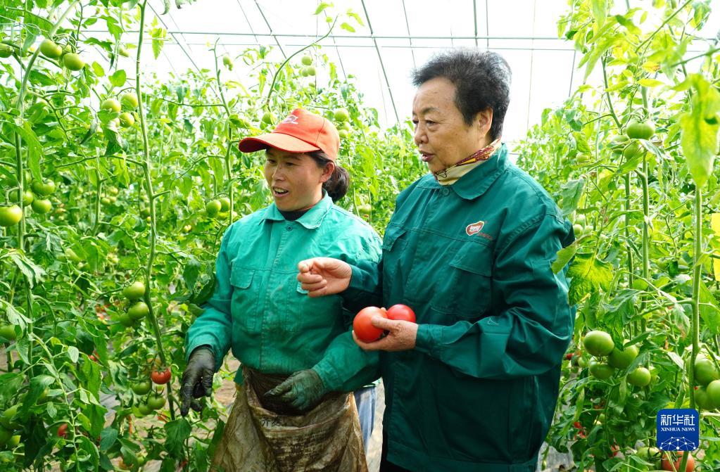 2月20日,在山东省曹县五里墩村,王银香(右)在生态农场里与村民交流。新华社记者 徐速绘 摄