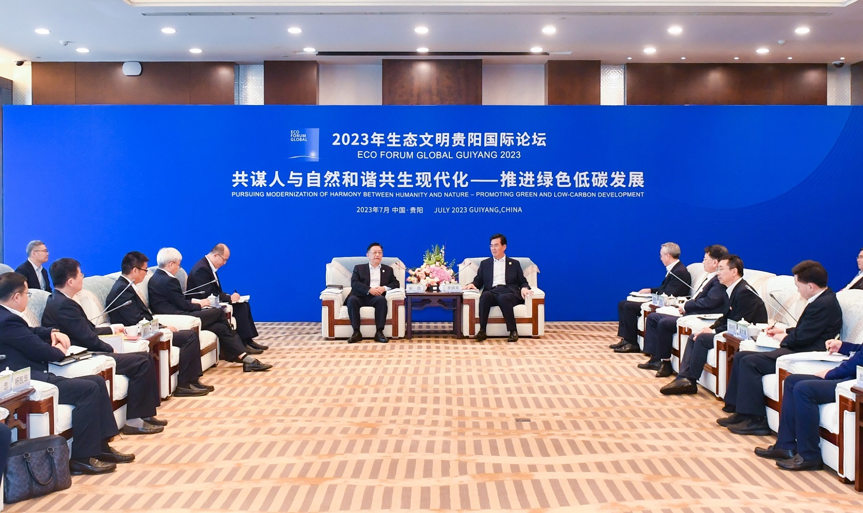 7月8日,省委副书记、省长李炳军在贵阳会见来黔参加2023年生态文明贵阳国际论坛的中国节能环保集团有限公司党委书记、董事长宋鑫一行。副省长蔡朝林、郭锡文参加。
