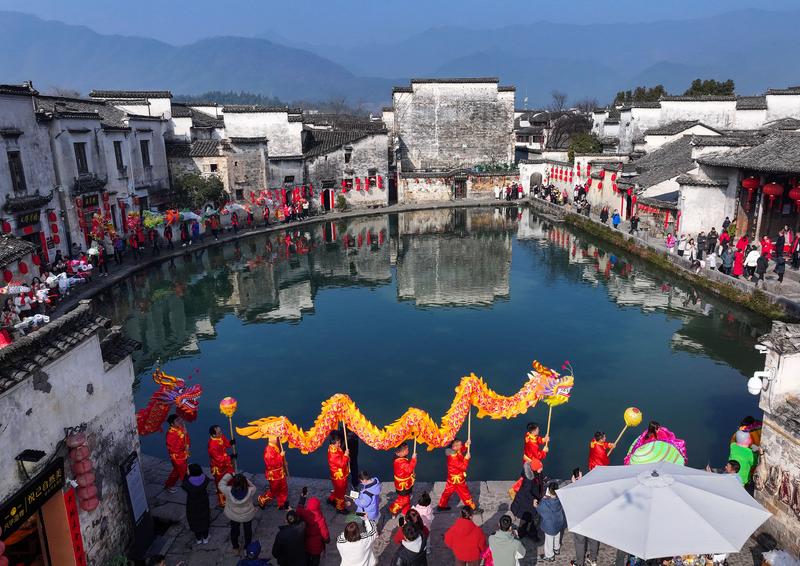 民俗舞龙表演队伍在安徽省黄山市黟县宏村巡游(2025年2月10日摄,无人机照片)。新华社发(施亚磊 摄)
