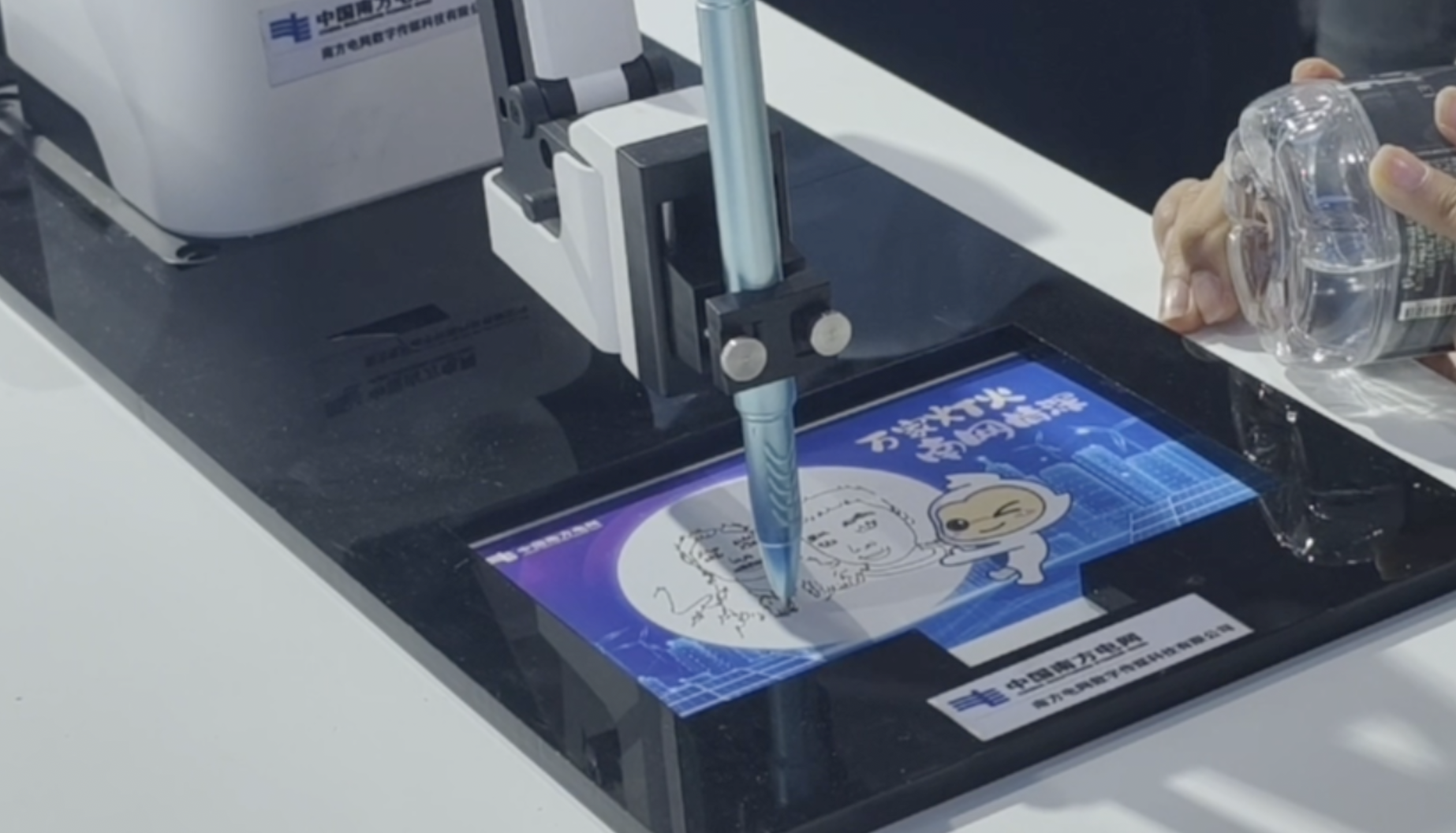 与通常的实时拍摄画像不同,南网展区的AI画像机器人创新采用了“上传照片—AI创作—机械臂绘制”的模式。参观者只需通过展台配备的终端设备或自己的手机扫描二维码,上传一张清晰的人像照片,先进的AI算法便会开始工作:首先智能识别面部特征和表情,然后结合学习过的艺术风格数据库进行二次创作,最后由精密的机械臂执笔,在画纸上勾勒出一幅独具特色的艺术肖像。
