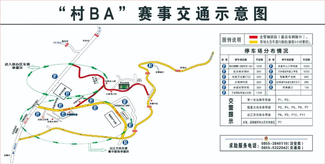 贵州省第三届美丽乡村篮球联赛总决赛及春季“村晚”期间,台盘乡车流人流增大,台盘停车场资源有限,为了你的出行便利,建议前往台盘村BA篮球场观看球赛的广大市民选择搭乘公共交通,尽量不要自驾出行;自驾车辆的,主动停放在指定停车场,服从现场指挥人员的指挥。