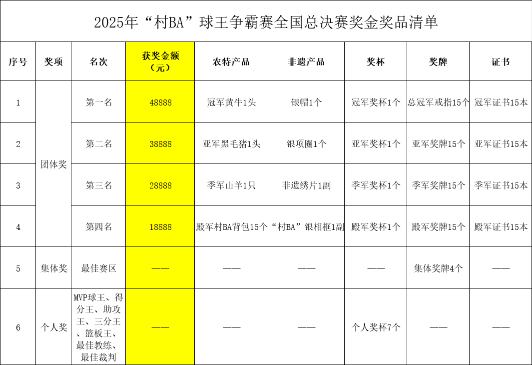 还在羡慕NBA的冠军戒指和巨额奖金?快来围观咱们自家“村BA”的冠军奖励!2025年“村BA”球王争霸赛全国总决赛奖品清单正式公布,赛事不仅延续了接地气的农特产品奖励,还增加了极具纪念意义的总冠军戒指,这份融合了“土味”豪气与民族文化底蕴的奖励,再次证明了“村BA”独一无二的魅力!