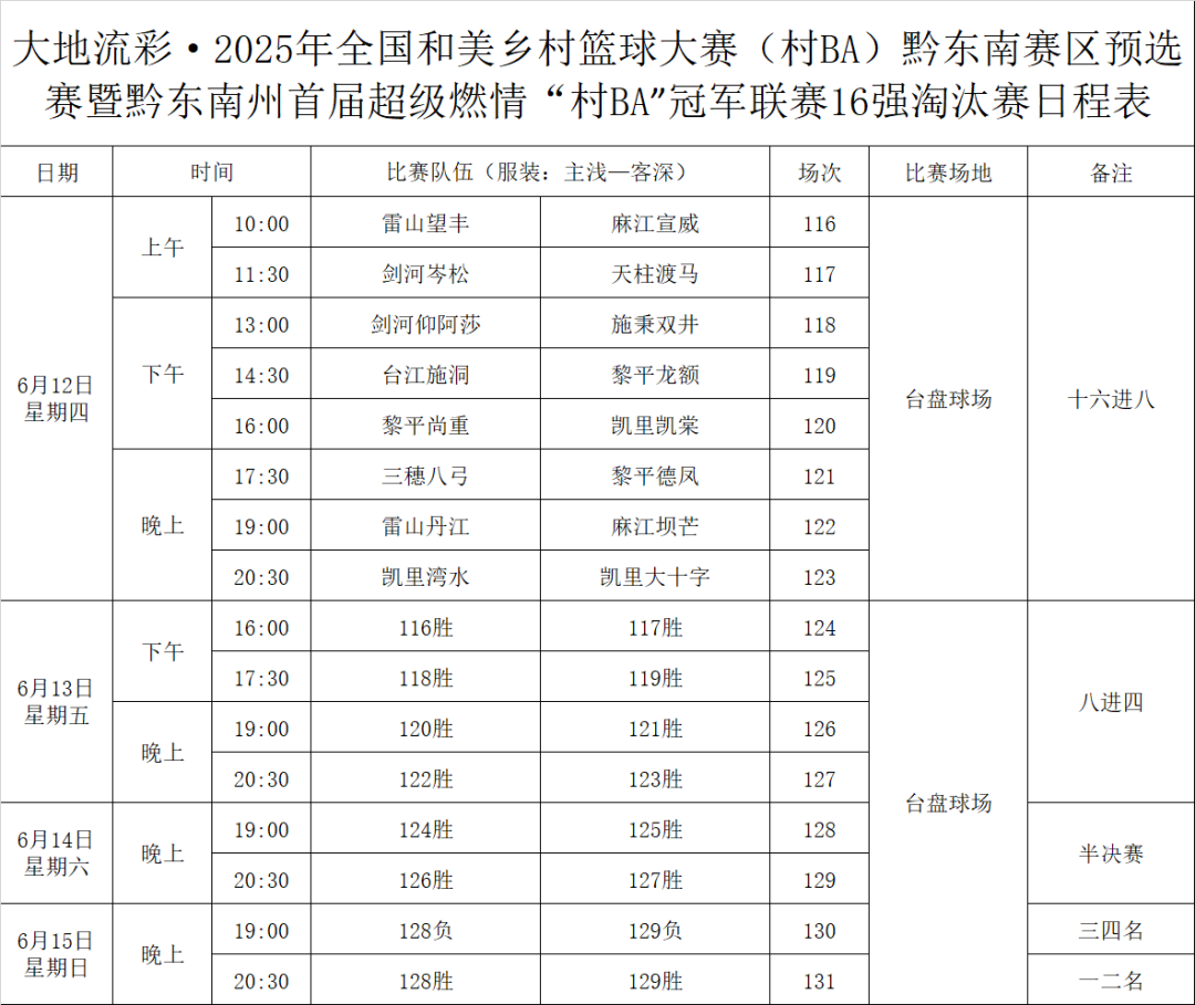随着H组最后一场比赛的终场哨响,黔东南州首届超级燃情“村BA”冠军联赛小组赛阶段正式落下帷幕。根据赛程安排,“16进8”淘汰赛将于6月12日打响,比赛采用单场决胜制,胜负悬念陡增,竞争将更加白热化。