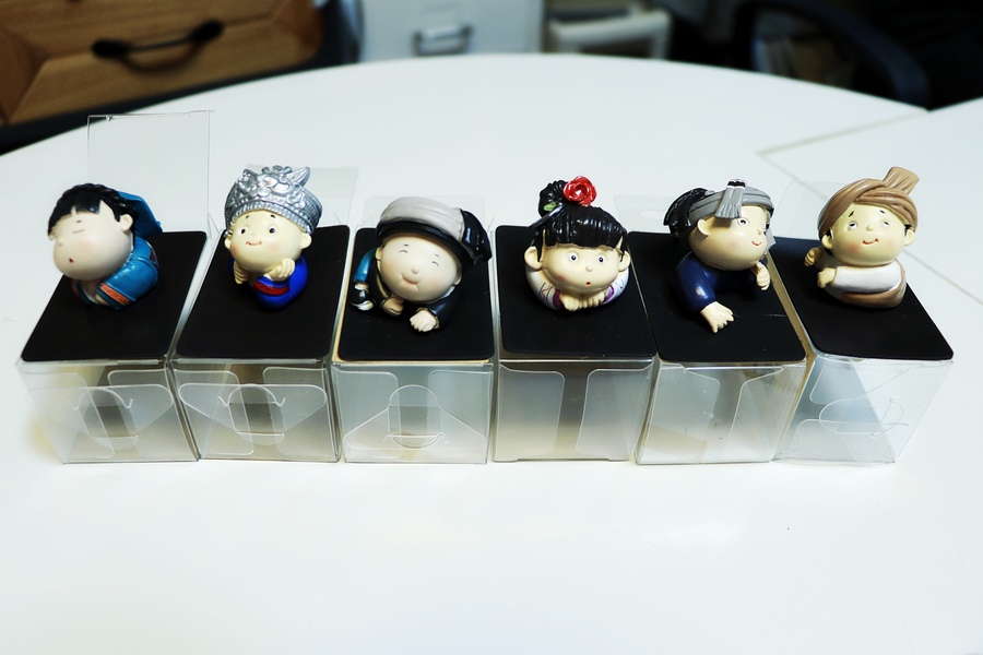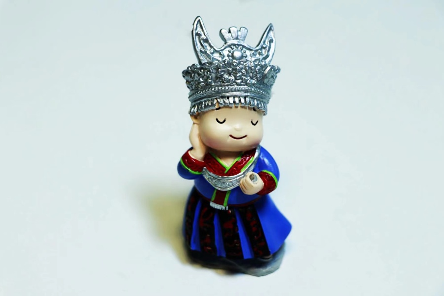 谈到创作理念,冯婷娓娓道来。“这个系列产品的创作初衷是基于贵州少数民族形象,站在市场可接受度上,结合现代审美和消费习惯,本着可观赏、可收藏、可带走的初衷设计大众需要的产品。它属于民族人偶体系,角色设定来自图话黔城的一个IP形象,这次参赛作品是这套人物形象的另一种表达方式,我们把这套产品定位为穿墙术,共八个角色”。