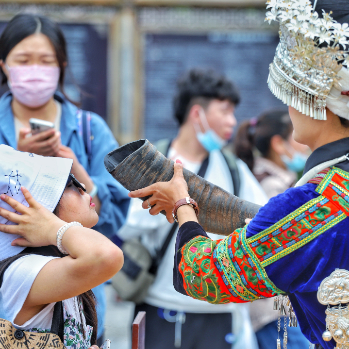 文化兴则村寨兴,随着乡村振兴战略的不断推进,西江千户苗寨景区紧紧以文化为抓手,苦练内功,强文化、搞建设、抓服务,以“文化+”强化文旅融合,打造出“十二道拦门茶”、“嘎歌古巷茶旅一条街”、“苗语角”、“西江讲堂”、“千家灯火工程”、“游方对唱”等文化互动活力十足的节点,游客们通过体验活动感受到了西江苗寨文化作为中华传统文化的优秀魅力,不断满足了游客们对旅游地文化高质量体验的需求,吸引更多游客前来体验苗族农耕生活、感悟非遗文化,助力乡村振兴。