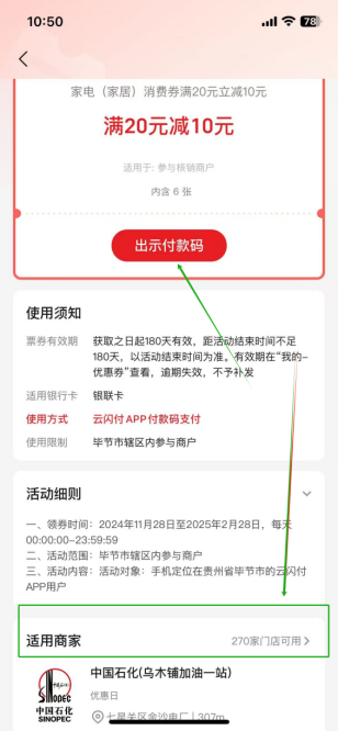 消费者在获取云闪付APP消费满减券包后,在市内包括但不限于商超便利、加油、餐饮等企业出示云闪付APP付款码可核销。查看券包、核销商户流程如下图: