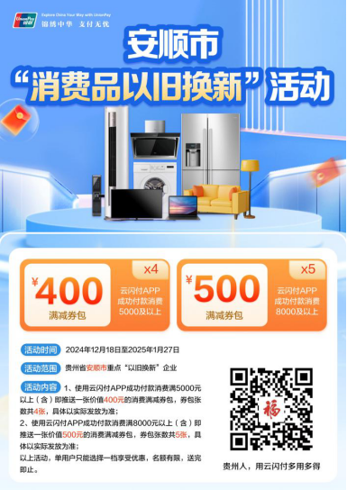 本次以“消费品以旧换新”活动为主题,将持续到2025年1月27日。消费者在市内重点企业:开发区铭诚家电经营部、普定县成峰电器经营部、拓捷行电子商务有限公司、华龙商贸有限公司、开发区泽琳电器经营部等企业,享受国补家电家居政策同时,对于消费达标的再次给予市级消费满减券包优惠。消费满减券包通过银联云闪付APP发放至消费者。