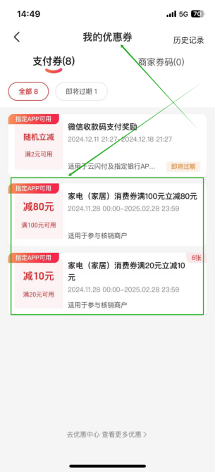1.查看券包“云闪付APP-我的-优惠券”。