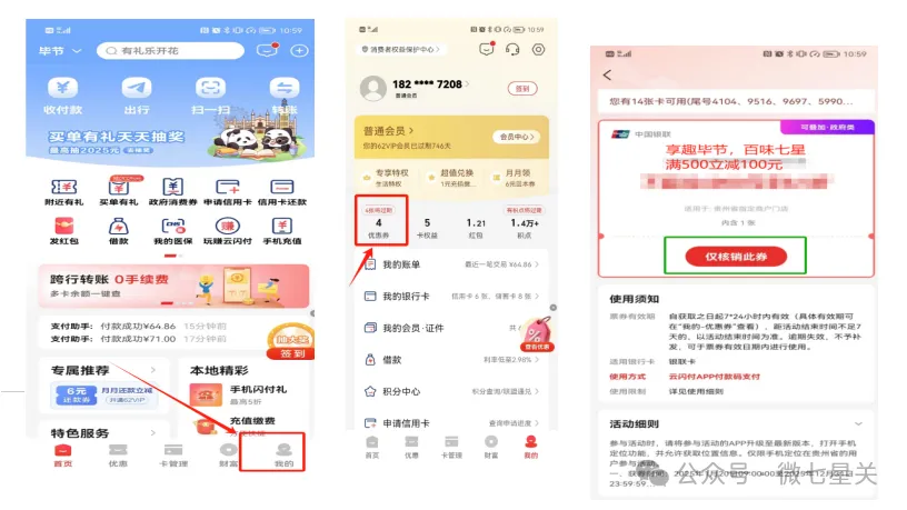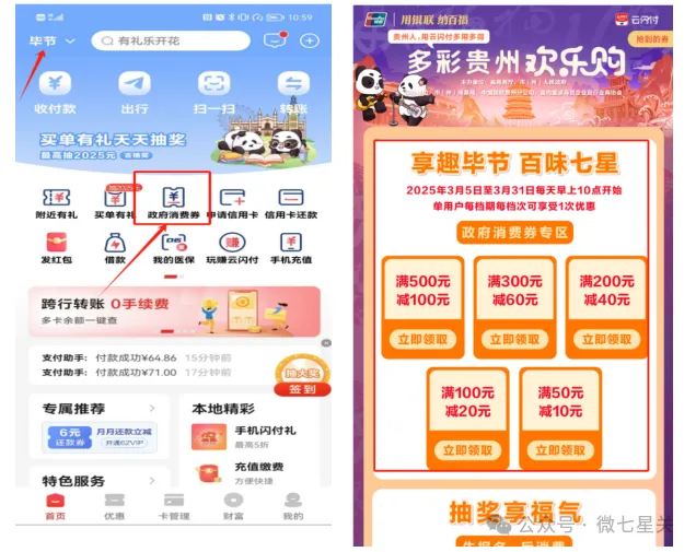 领取方式:打开云闪付APP,实名认证且定位在毕节市七星关区,云闪付APP-进入“政府消费券专区”领取。