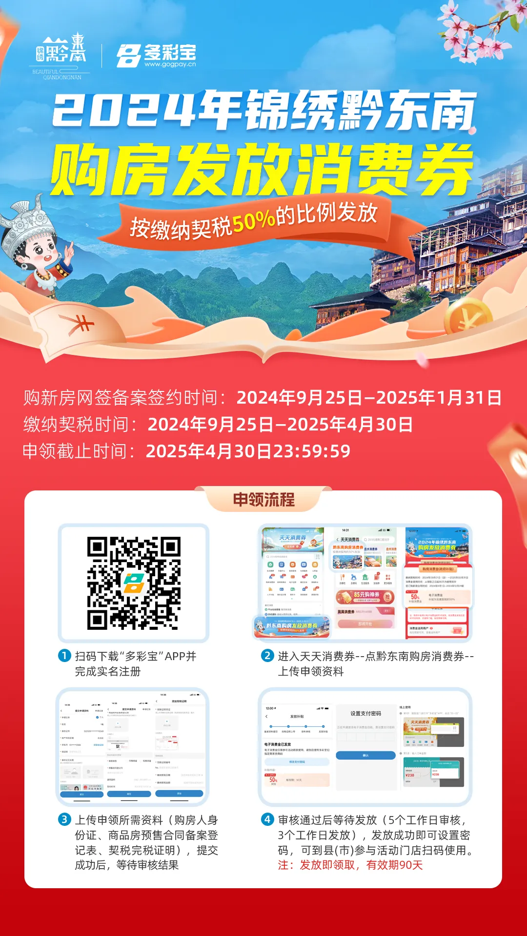 对2024年9月25日——2025年1月31日期间个人在黔东南州辖区内购买新建商品住房且完成商品房预(现)售合同登记备案(备案日期在2025年1月31日前),并于2025年4月30日前缴纳契税的,购房人于2025年4月30日前持商品房买卖合同和契税完税凭证到指定活动平台申领消费券。各县(市)按照购房人实际缴纳契税50%的比例发放消费券补贴。需要注意的是,公寓及公司购房不在此次活动补贴范围内。