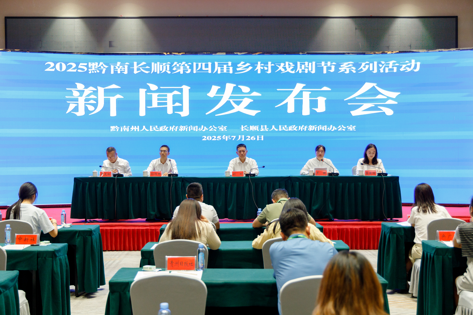 7月26日,“半城山水半城戏 一谷神泉一谷梦”2025黔南长顺第四届乡村戏剧节系列活动新闻发布会在贵阳市观山湖区瀛洲酒店举行。长顺县委副书记、县人民政府县长刘刚,长顺县委常委、县委宣传部部长、县委统战部部长罗璇,长顺县委常委、县人民政府副县长孙同林出席发布会,发布会全面介绍了长顺县在旅游发展、文化传承及本届乡村戏剧节活动筹备等方面的情况。本次新闻发布会由州委宣传部常务副部长、州精神文明办主任李灵松主持。
