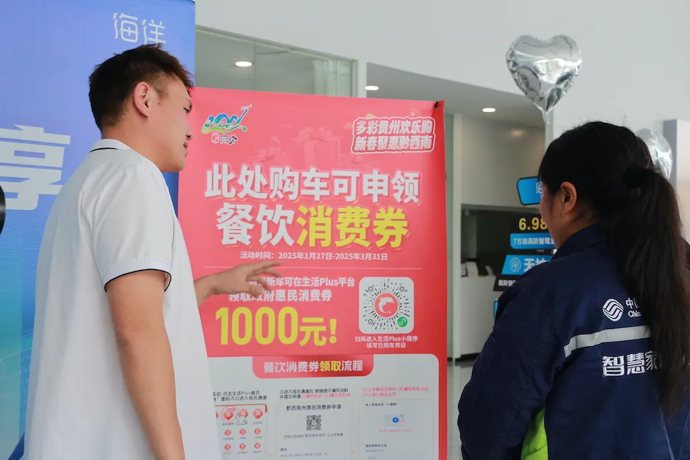 前来订车的消费者杨世榜说:“因为有这个补贴,我才想来买车。补贴减轻了我们的负担。今天买车时,他们还介绍了消费券的领取方式,听说可以在‘生活Plus’平台上申请,并在相关餐厅使用,这让我觉得非常实惠。”
