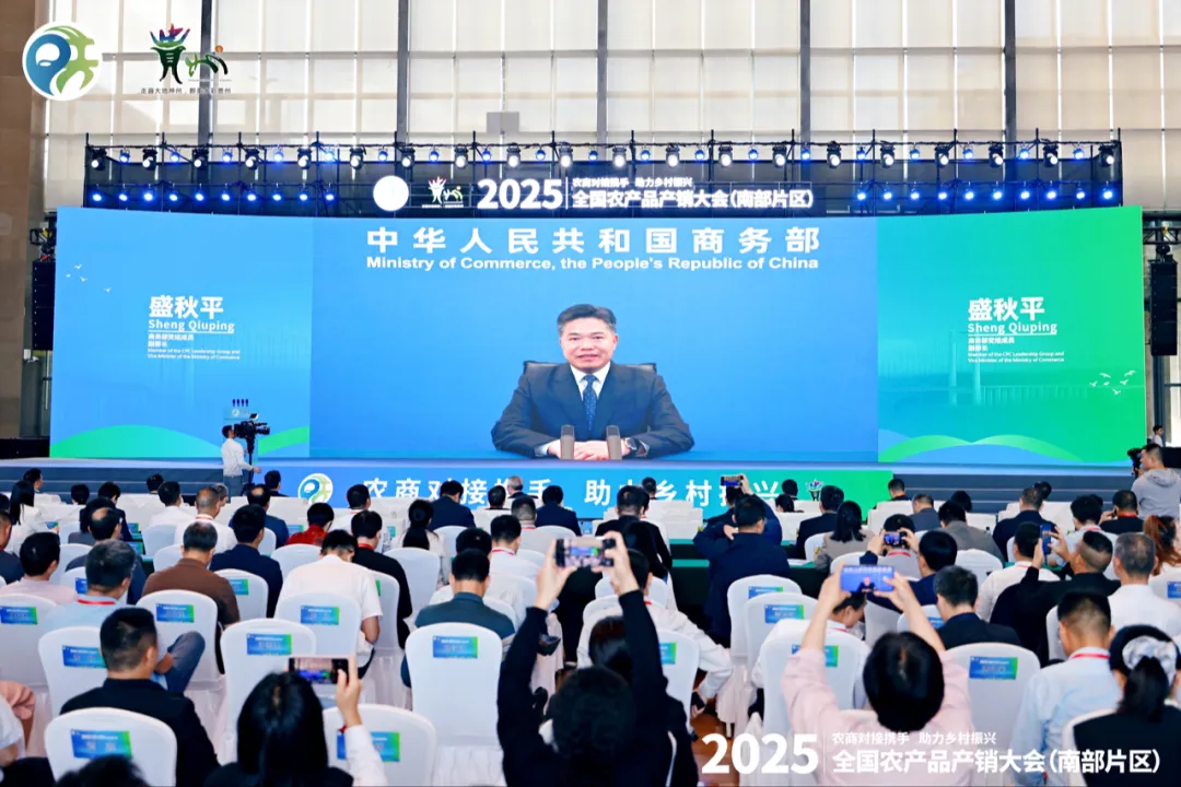 开幕式上,商务部副部长盛秋平通过视频致辞。他表示,农产品产销对接是链接生产和消费的重要桥梁,是农产品流通体系的重要内容,对于提升居民消费品质、带动农民增收具有重要意义。当前,我国农业生产的主要矛盾集中体现为阶段性供过于求和供不应求并存的结构性矛盾。面对新形势新任务,商务部在前期工作的基础上,以“农商对接携手 助力乡村振兴”为主题,升级举办全国农产品产销大会。期待各界用好产销大会平台,强对接、谈合作、促共赢,推动南部片区农特产品出村出山,走向全国、融入湾区、走向世界。