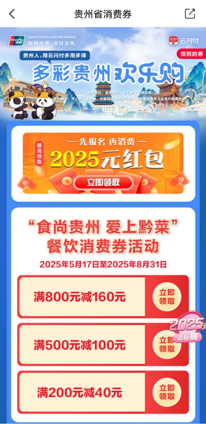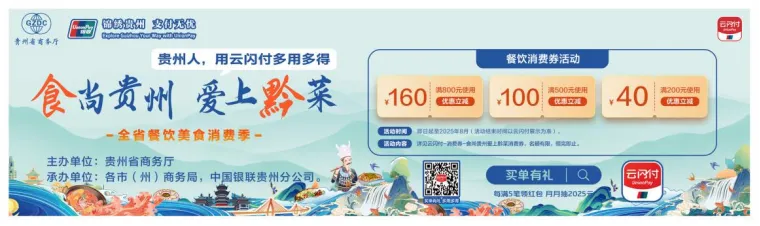 本次“食尚贵州 爱上黔菜”美食消费券类别设置为满800元减160元券、满500元减100元券、满200元减40元券,即日起到2025年8月31日,每日10:00准时开抢,消费者可登录云闪付APP领取消费券。