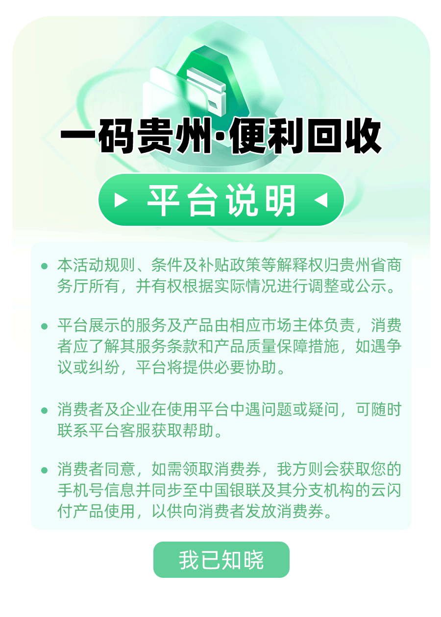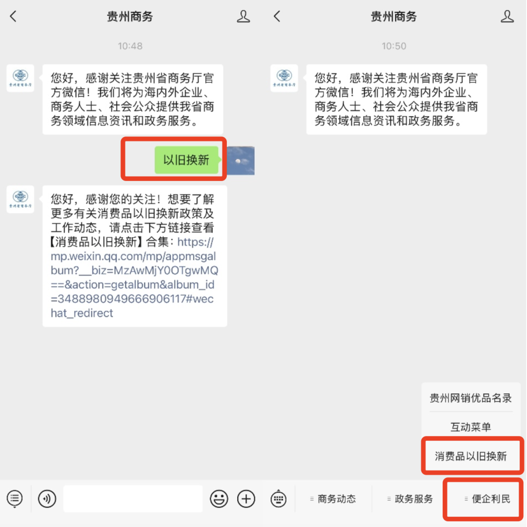 此外,如果消费者想要了解更多有关消费品以旧换新政策及工作动态,可关注“贵州商务”微信公众号,发送关键词“以旧换新”,或通过菜单栏【便企利民】,即可获取【消费品以旧换新】合集链接,详细了解相关内容。