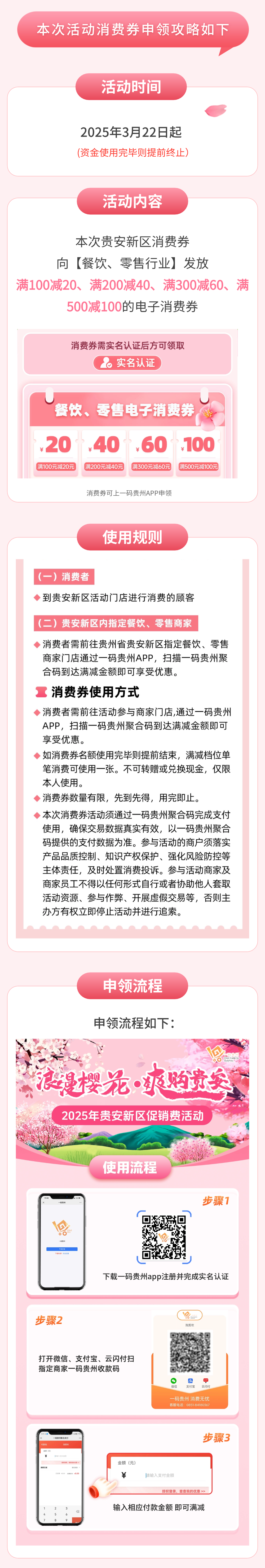 活动将于2025年3月22日正式开启,由贵安新区投资促进局(商务局)主办,贵州电子商务云运营有限责任公司(一码贵州)承办,将向餐饮及零售行业发放“满100-20、满200-40、满300-60、满500-100”四个档位的电子消费券,消费者可在“一码贵州APP”上实名认证后进行申领,在贵安新区参与商家门店进行消费。