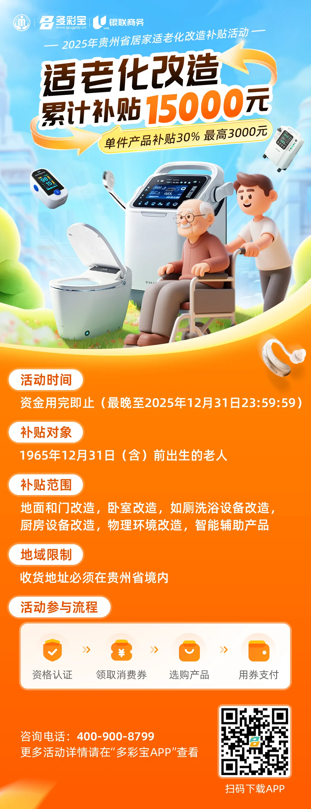 为提升老年人居家养老的安全性与便利性,切实增强老年人的获得感、幸福感、安全感,省民政厅联合多部门启动“2025年贵州省居家适老化改造补贴活动”,活动将于2025年8月16日上午10:00通过“多彩宝”APP正式开始,旨在通过政府支持、企业让利的方式,引导老年人家庭进行居家适老化改造,为老年人创造更加舒适、安全的居家环境。