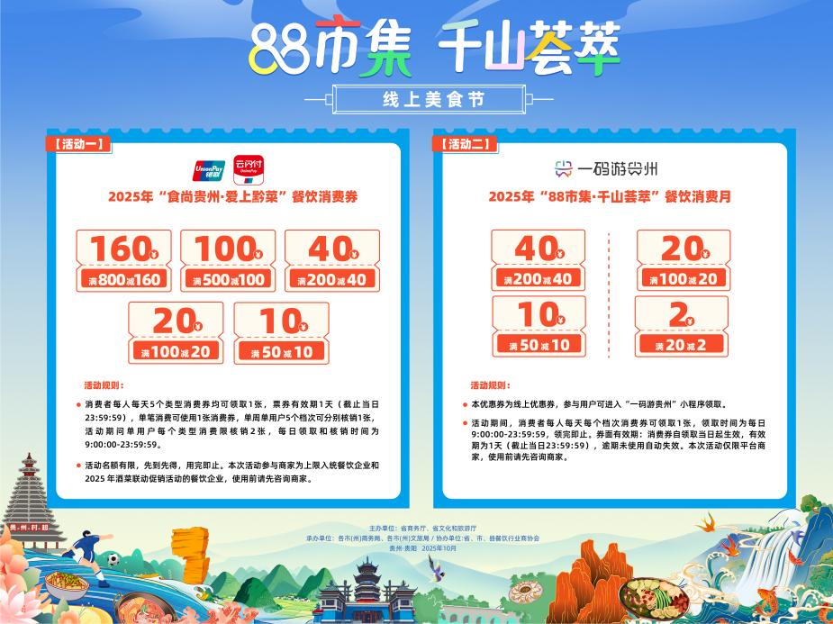 活动期间,还将配套开展2025年“食尚贵州·爱上黔菜”餐饮消费券活动,面向省内外消费者发放满800元减160元、满500元减100元、满200元减40元等5类消费券,消费者在云闪付APP领取后,可前往重点餐饮企业和酒菜联动促销活动的餐饮商户使用。同时,主办方还联合了“一码游贵州”平台推出了“88市集·千山荟萃”线上美食节活动,联合景区、酒店、餐饮商户等推出“美食+景区门票+酒店”等联票优惠。