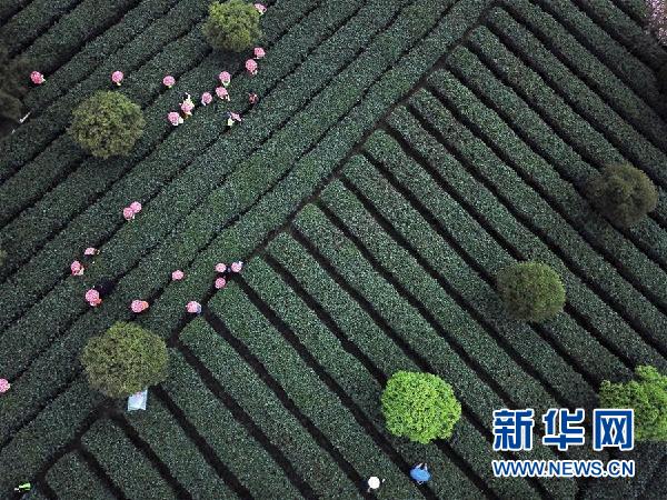 孩子们在贵州省遵义市湄潭县湄江街道核桃坝村体验采茶(4月1日无人机拍摄)。杨文斌 摄