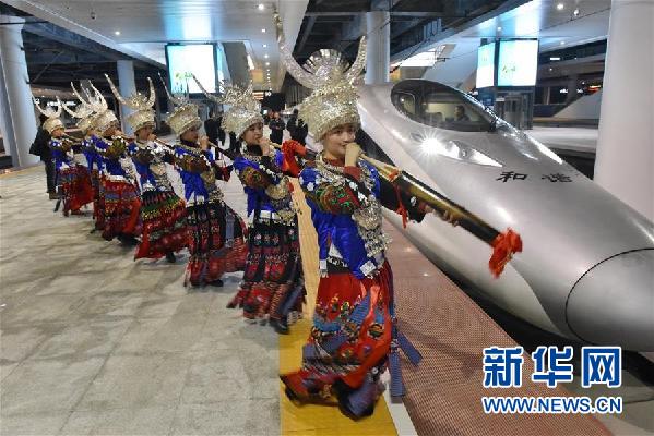 苗族同胞在贵阳北站载歌载舞庆祝渝贵铁路全线开通运营(1月25日摄)。欧东衢 摄