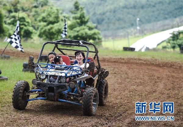 游客在贵州六盘水市玉舍国家森林公园滑草场游玩(8月10日摄)。陶亮 摄
