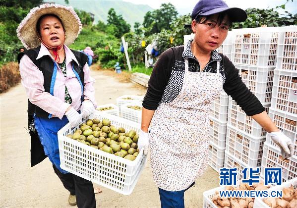 村民在六盘水市水城县米箩镇俄戛村搬运已装箱的红心猕猴桃(2017年8月12日摄)。陶亮 摄