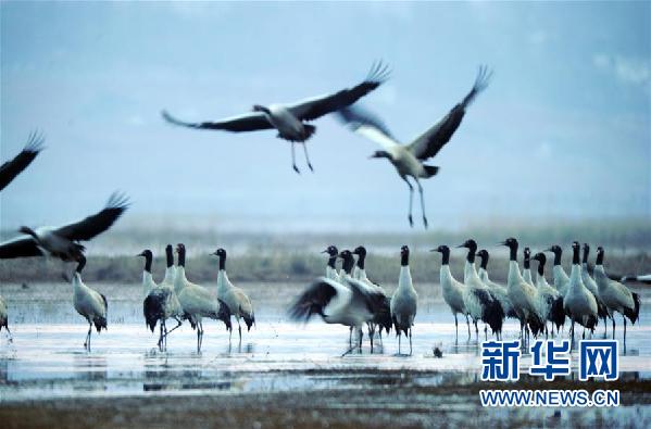 在贵州草海保护区越冬的国家一级保护动物黑颈鹤(3月9日摄)。杨文斌 摄