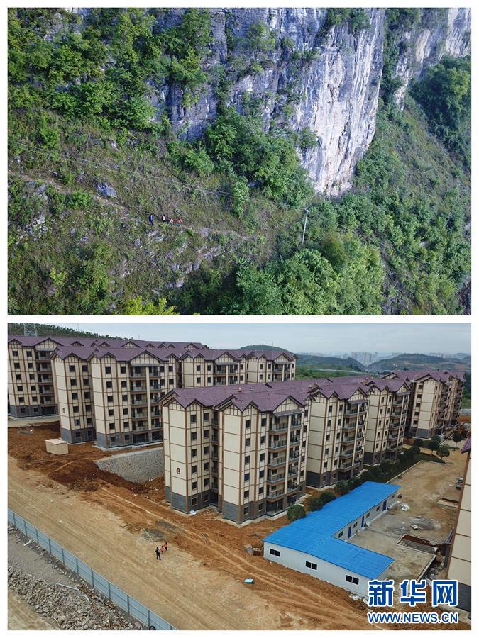 拼版照片:上图为贵州省毕节市黔西县金兰镇瓦房村哈冲组一景(4月27日摄);下图为哈冲组村民的新居——位于黔西县城的易地扶贫搬迁锦绣花都安置点(5月7日摄)。欧东衢 摄
