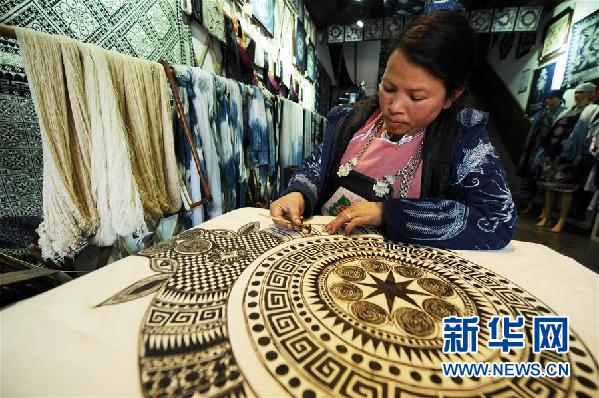 贵州省丹寨县万达小镇景区一家蜡染体验馆的蜡染手工艺人在制作蜡染(4月9日摄)。杨文斌 摄