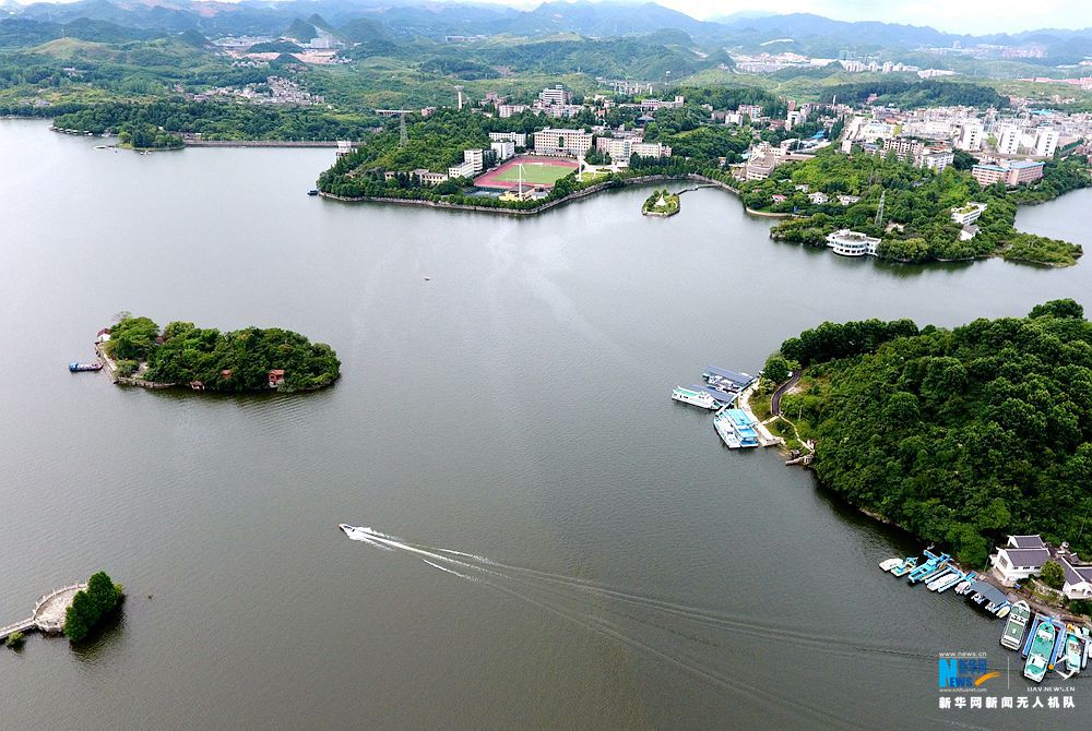 2007年11月,全国首家独立建制的环境保护法庭——清镇市环境保护法庭(现清镇市生态法庭)在清镇市成立。十年间,清镇市生态法庭依法严惩破坏和污染生态环境行为。图为航拍的贵州清镇市红枫湖,红枫湖是长江二级支流猫跳河的上游,是贵阳市和贵安新区重要的饮用水源地。