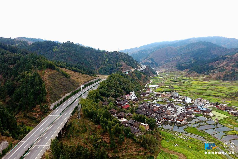 2015年底,贵州成为西部地区第一个县县通高速的省份,也是全国为数不多实现这一目标的省份之一。图为航拍的贵州从江县洛香镇归合村,高速公路经过一个侗寨。