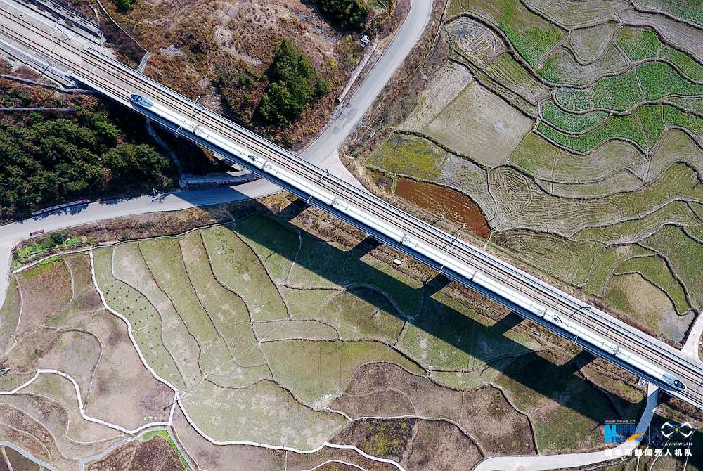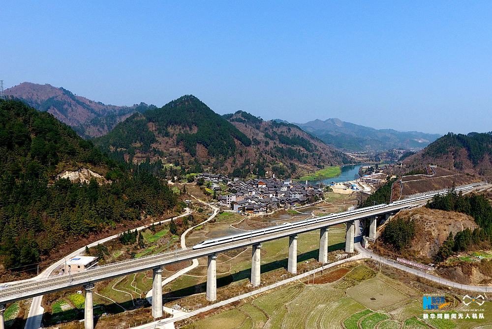 2014年12月,贵广高铁建成通车,贵州省历史性地迈入“高铁时代”。再到沪昆高铁和渝贵铁路相继开通,短短3年多时间,贵州的高铁运营里程已超过1200公里。图为航拍动车在贵州省内铁路上行驶。
