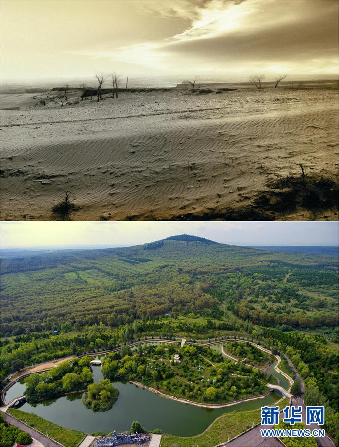 拼版照片:上图为治理前,山西朔州市右玉县的荒凉沙地(资料照片);下图为右玉县小南山森林公园(新华社记者曹阳8月7日摄)。右玉县林木绿化率从1976年的12.66%增至2017年的54%,在黄土高原上树起一道绿色丰碑。