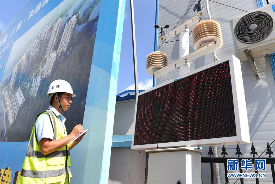 在广西南宁市一处建设工地,工作人员在查看安装在工地的扬尘在线监测系统有关数据(5月25日摄)。近年来,广西南宁市充分利用智慧城市建设成果,建立扬尘治理视频综合管理系统,全力呵护“南宁蓝”。  陆波岸 摄