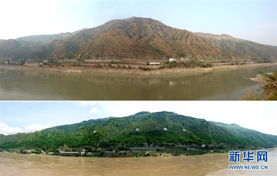 这张拼版图片是实施天然林保护工程前后的四川攀枝花市三堆子人工造林区(上图摄于1998年,下图摄于2008年)。这里是全国天然林保护工程发源地。
