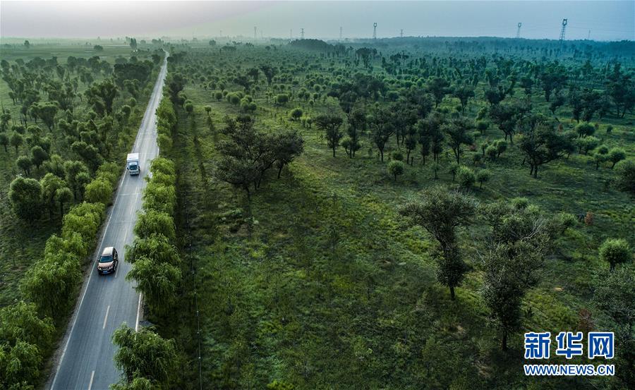 汽车行驶在陕西榆林市靖边县东坑镇新建村的道路上(8月1日无人机拍摄)。陕西省开展的天然林保护工程和全面治理荒沙行动,极大改善了毛乌素的生态环境,也使沙漠南缘的陕西省榆林市实现从“沙进人退”到“绿进沙退”的转变。陶明 摄