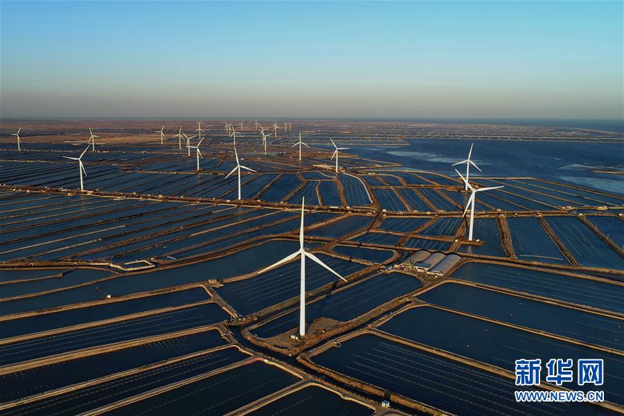 这是河北省唐山市乐亭县姜各庄镇海边养殖区内的风电场(11月10日无人机拍摄)。如今,中国清洁能源占比迅速提高、产业规模世界第一。杨世尧  摄