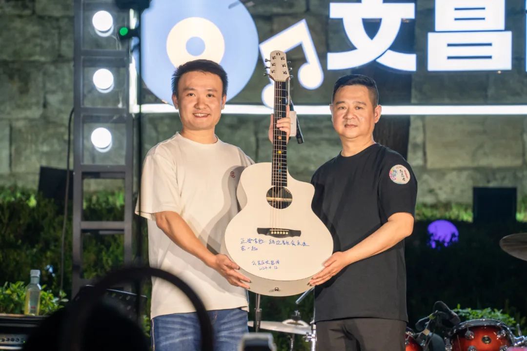 正安县被誉为“中国吉他之都”,是全国集聚程度最高、产销规模最大的吉他生产基地。目前,世界10大吉他品牌中,就有6个在正安代工生产,年产吉他200余万把。音乐会上,正安县吉他文化产业发展中心副主任万其林代表正安县向贵阳路边音乐会·文昌阁赠送了正安生产的吉他,并献唱了汪峰的歌曲《花火》,向现场的市民、游客展示正安人民对音乐的喜爱,也邀请大家到正安感受吉他的魅力。