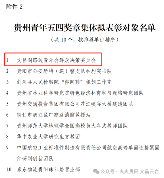 正在公示中!文昌阁路边音乐会群众决策委员会荣获贵州青年五四奖章集体