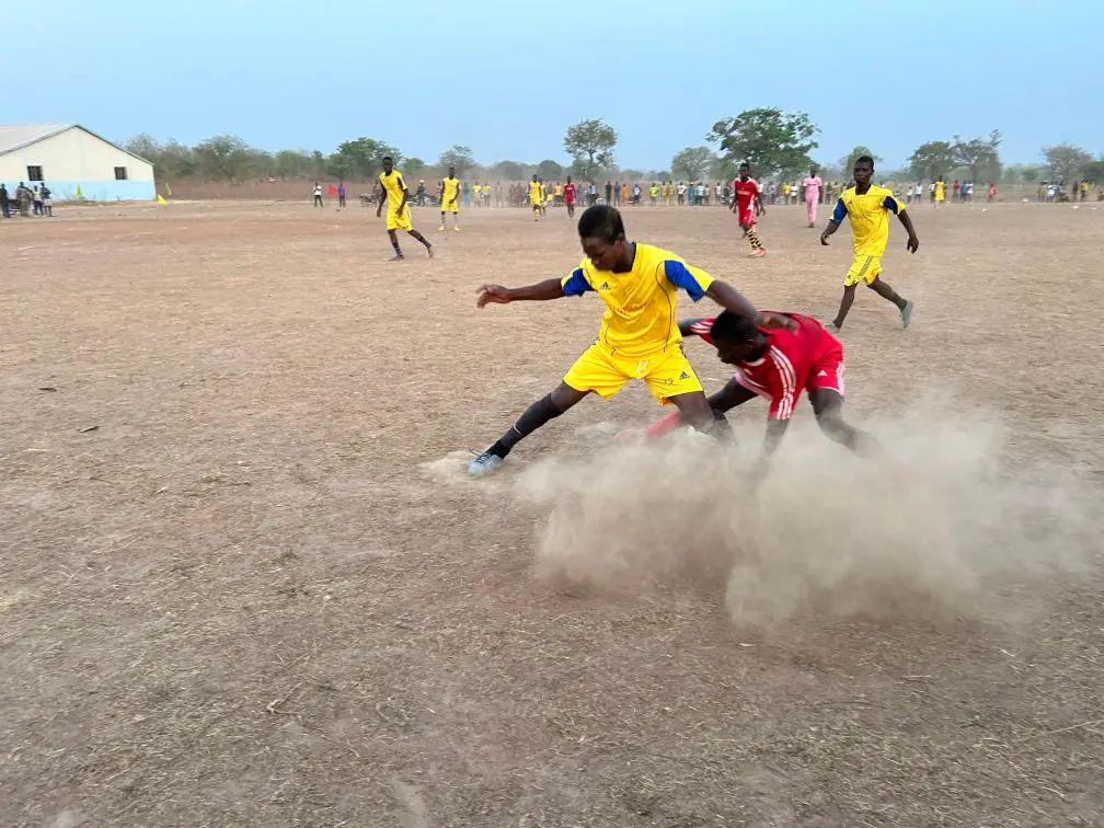 3月31日,贝宁当地村民球员在非洲“村超”比赛中拼抢。受访者供图