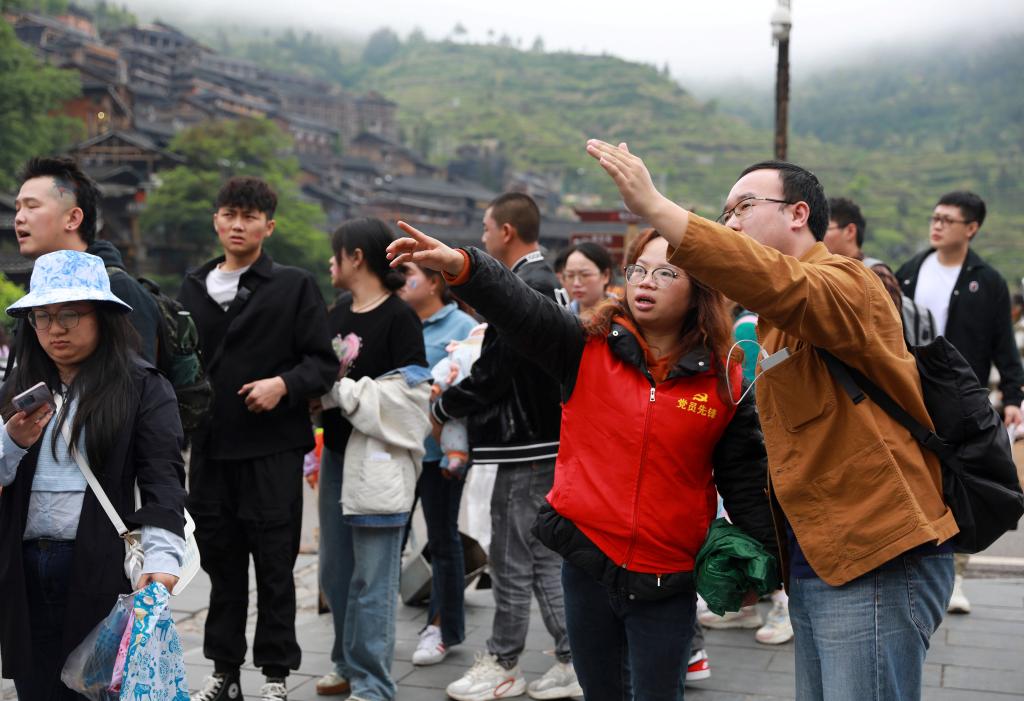 5月3日,党员志愿者在贵州省黔东南苗族侗族自治州雷山县西江千户苗寨景区为游客指路。新华社发(吴贤燕 摄)