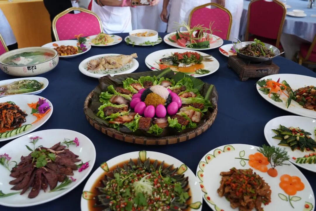 9月11日的培训课堂上,学员们分成5组同台竞技,每组分批完成3道特色菜品的制作与展示。“这道‘村超足球汤圆’,既有咱们过年的团圆意,又融入了村超元素。”学员杨丽指着盘中形似足球的汤圆介绍,旁边的腌鱼、腊肉拼盘则寓意“各民族共筑村超情”。现场,“绿茵牛瘪”“红黄牌辣子鸡”“鱼跃冲顶酸汤鱼”等创意菜品依次亮相——这些美食既保留了牛羊瘪、侗族腌鱼等榕江传统风味,又巧妙植入赛事符号。