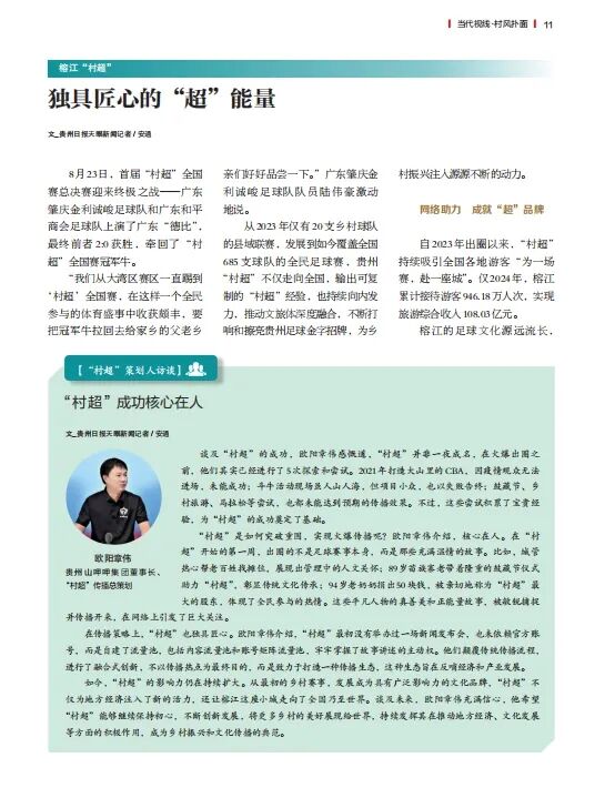 如今,“村超”的影响力仍在持续扩大。从最初的乡村赛事,发展成为具有广泛影响力的文化品牌,“村超”不仅为地方经济注入了新的活力,还让榕江这座小城走向了全国乃至世界。谈及未来,欧阳章伟充满信心,他希望“村超”能够继续保持初心,不断创新发展,将更多乡村的美好展现给世界,持续发挥其在推动地方经济、文化发展等方面的积极作用,成为乡村振兴和文化传播的典范。