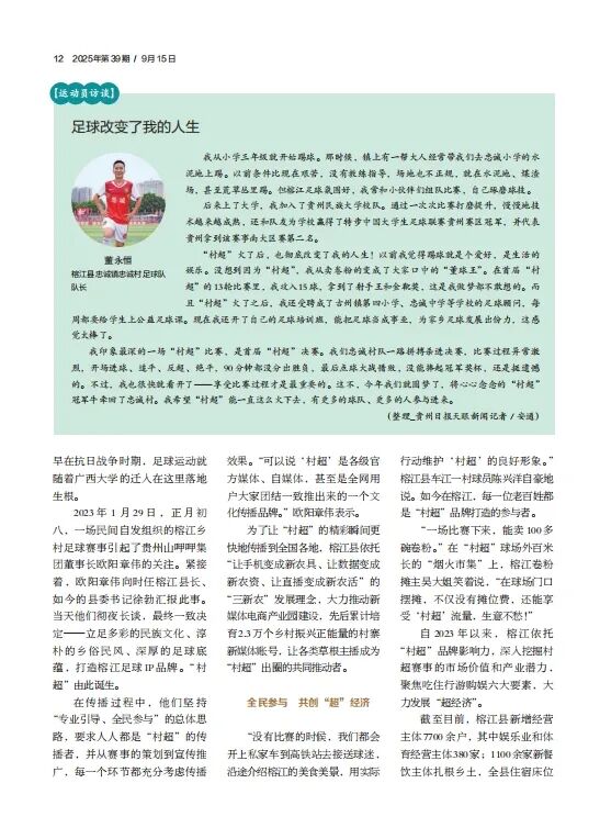 “村超”火了后,也彻底改变了我的人生!以前我觉得踢球就是个爱好,是生活的娱乐。没想到因为“村超”,我从卖卷粉的变成了大家口中的“董球王”。在首届“村超”的13轮比赛里,我攻入15球,拿到了射手王和金靴奖,这是我做梦都不敢想的。而且“村超”火了之后,我还受聘成了古州镇第四小学、忠诚中学等学校的足球顾问,每周都要给学生上公益足球课。现在我还开了自己的足球培训班,能把足球当成事业,为家乡足球发展出份力,这感觉太棒了。