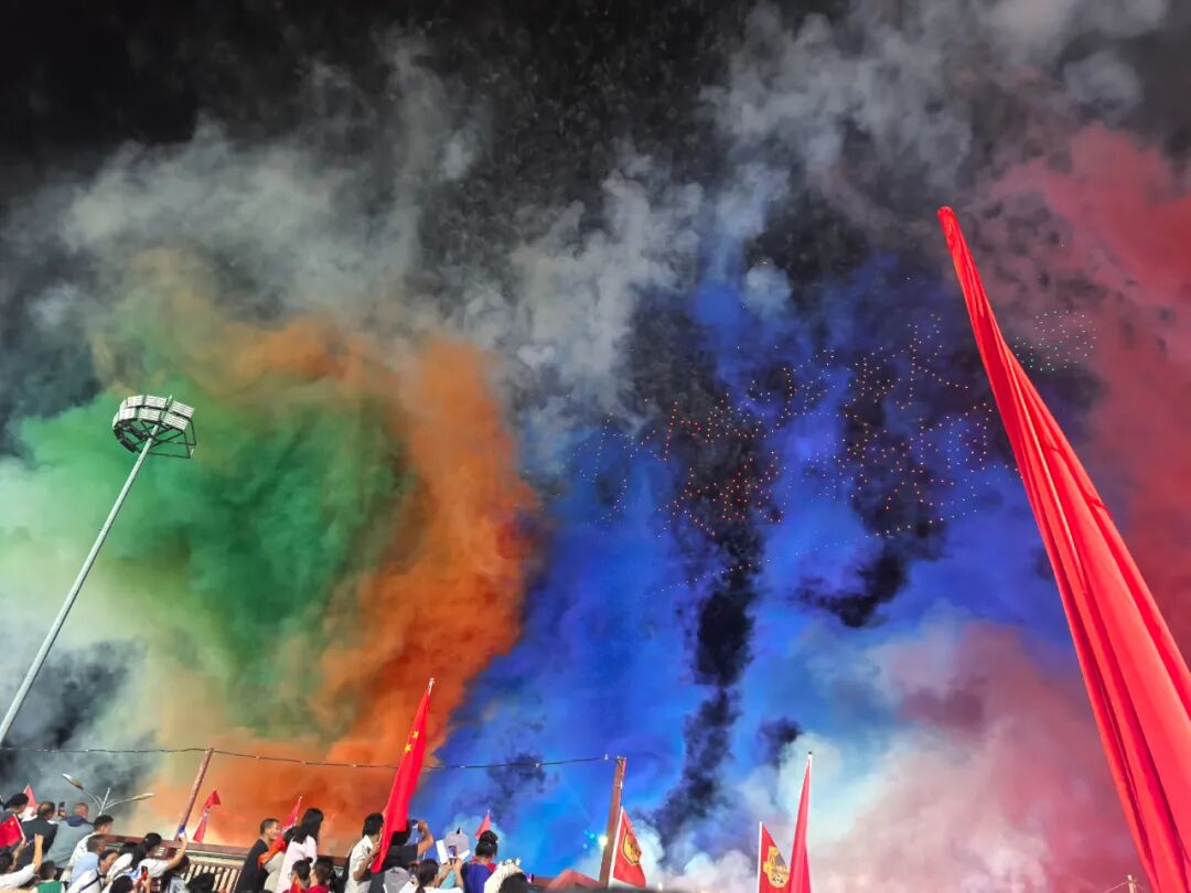 烟花绽放,无人机在夜空组成“小小足球 大大的梦想”字样