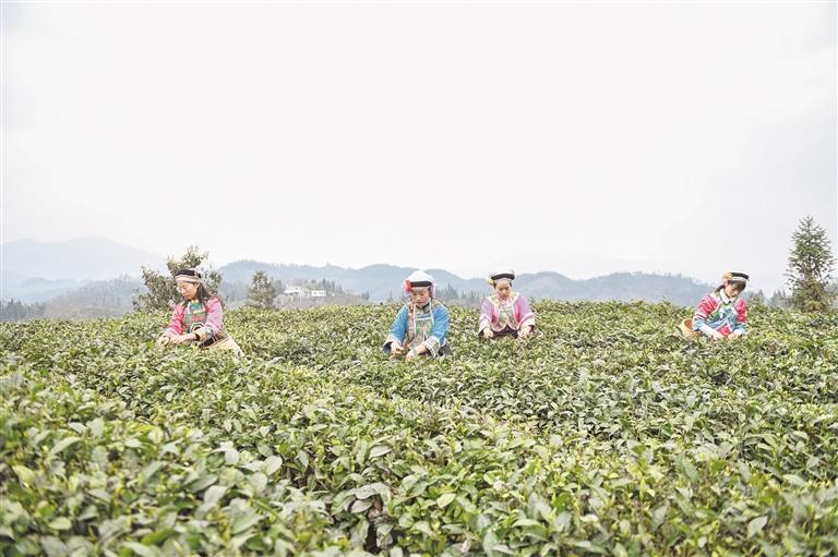 绵延至4月,各处茶园春色日茂。屯上村的“白叶一号”茶园火红的杜鹃花怒放,联盟村的茶园茶花芬芳,细寨村的茶园桃李竞开。掩映在杉柏丛中的布依族村落翘着瓦檐、飘着采茶曲、浸着春茶香、迎着购茶客。