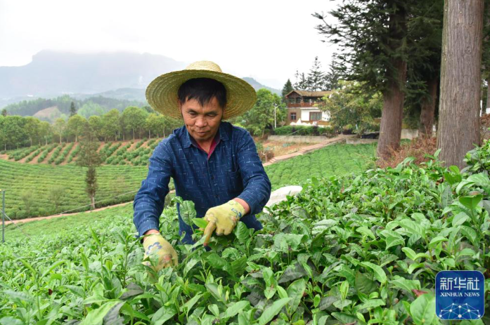 远处高山云雾缭绕,近处茶园翠绿油亮。清明采茶好时节,在贵州省黔西南布依族苗族自治州普安县茶源街道联盟村的生态茶场,62岁的布依族茶农卢关成和老伴正忙着采摘茶青。